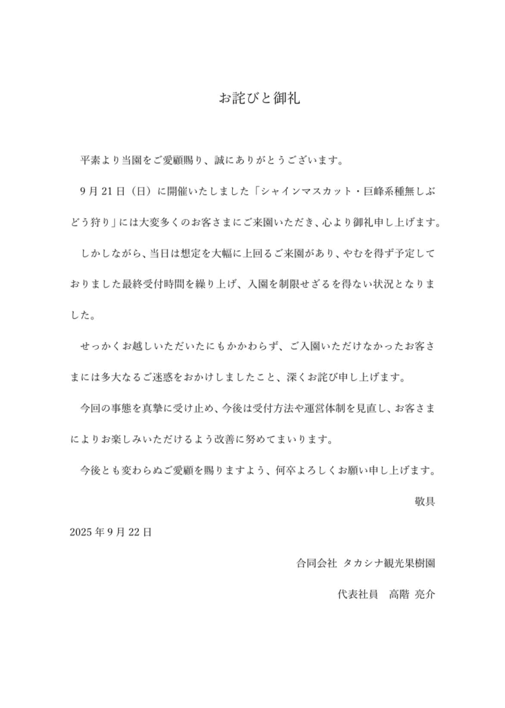 シャインマスカット・巨峰系種無しぶどう狩りのお詫びと御礼 2025 9/22 news 2025-09-22 ※最新情報は、X(Twitter) または Instagram からご確認いただけます。 news 関連情報 【追加】巨峰系種無しぶどう狩り開催のお知らせ! 2025-09-20 巨峰系種無しぶどう狩り開催のお知らせ! 2025-09-02 ぶどう狩りは8/16(土)から開始予定です! 2025-08-11 プラム狩りが8/2(土)から始まりました! 2025-08-02 ブルーベリー狩りが7/19(土)から始まります! 2025-07-18 2025年のさくらんぼ狩りは「7/1(火)」に開始予定です! 2025-06-28 バリアフリートイレ設置や車イスの貸し出しなどをしています! 2024-10-10 巨峰系種無しぶどう狩り開催のお知らせ! 2024-09-22